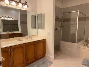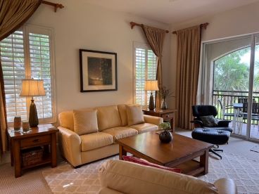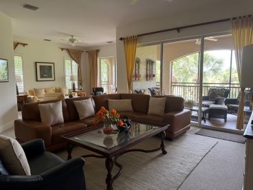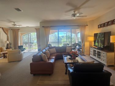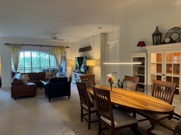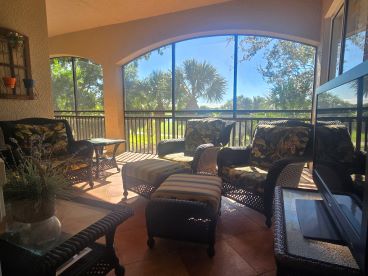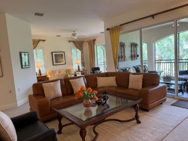 3 bedrooms + den / 3 bathrooms with 2 car garage. 2nd floor unit offers many luxurious upgrades. Nearly 3000 sq. ft under air, this coach home boasts a gorgeous carpeted staircase, high ceilings, carpeted bedrooms, living room, family room, dining room, and tiled kitchen, and bathrooms, and generous amounts of space throughout. Enjoy spectacular lake views from your oversized screened lanai. Beautifully furnished end unit provides light and bright space. Large, open living area with formal dining room. Kitchen boasts gas stove, granite counters, elegant back splash, and stainless steel appliances, with huge pantry space. Master suite with double walk-in closets, garden tub, glass walk-in shower, his and her sinks, and magnificent views. Each bedroom has its own full bath. Generous bedroom dimensions with large closet spaces. Full size washer and dryer in separate laundry room with utility tub. Community offers private heated swimming pool within Cherry Oaks and a spectacular Clubhouse with first-class resort-style amenities for a one-time transfer fee of $750. Water and basic cable and wi-fi are included in the rent. No Smoking. No Pets.